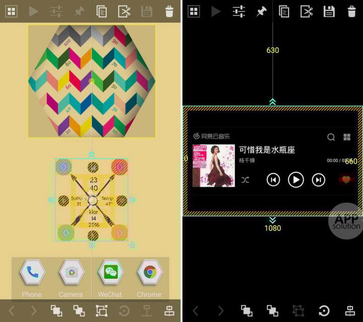 Total Launcher 的可定制性比之 Nova Launcher 高上不少。你可以自定义元素的位置:解锁桌面后通过左上角的按钮选择元素,随后就可以对元素的大小、宽度、位置等进行设置。你还可以根据每个页面元素的风格配上一张独特的壁纸。