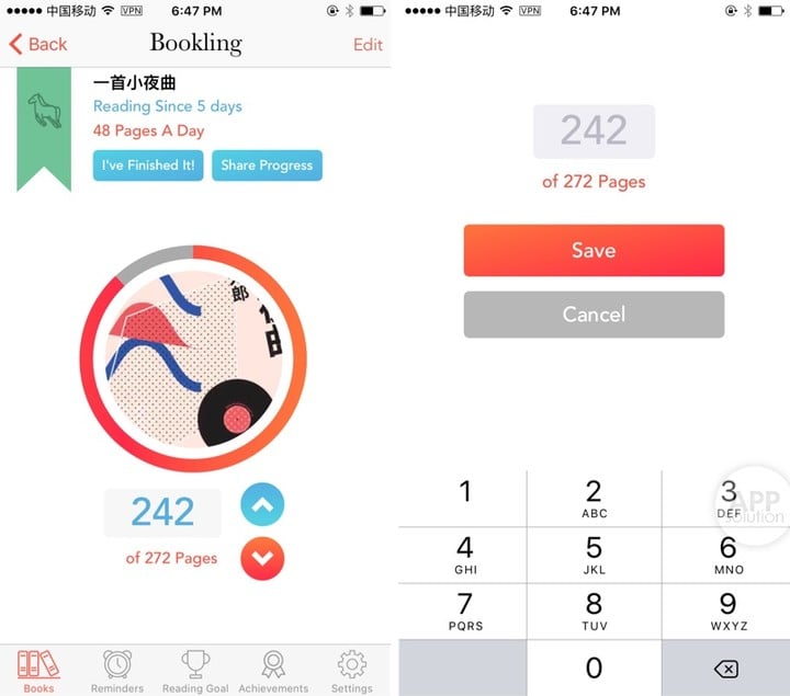 需要更新进度时,进入图书的详情页面后点击上下剪头或是直接输入页数即可。而在读书进度的展示上,Bookling 不仅在首页中采用了文字、环形进度条的双重表现方式,还采取了使用动物形象喻指的手法。