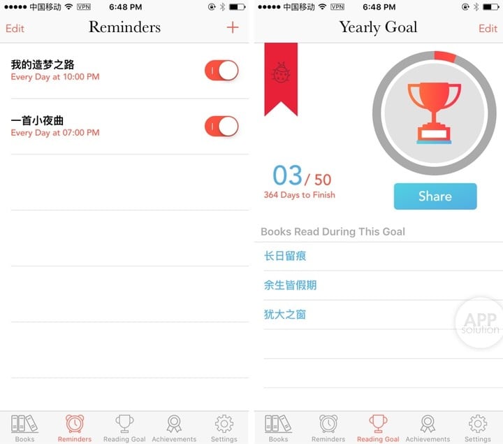 优秀的进度管理功能不是 Bookling 的全部,你甚至可以在 Bookling 中针对特定书籍添加灵活的提醒。除此之外,Bookling 还提供了设置阅读量目标的选项,方便你查看并监督今年的阅读情况。