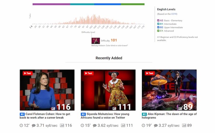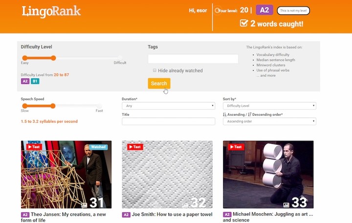 LingoRank 最大的特色就是它会透过自动的词汇分析、语速分析,帮每一则 TED Talks 影片加上「英文听力难度分数」。有了这些分数,就可以让不同水准的英文听力学习者,找到适合自己的影片,并且进行测验与练习。