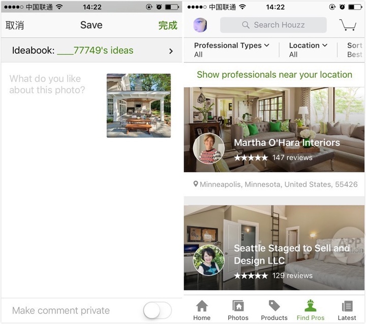 Houzz 庞大的内容体系与功能结构举重若轻地表现在了它的移动端设计中,最新版简约精致的扁平化界面加上流畅的体验,让人眼前一亮。照片按房间类型、风格及地理位置进行分类,如果你有「一见钟情」的装修样式或装饰,点击「Save」可以添加到自己的「Ideabook」里,即刻获得一本能够搜索,保存和共享的随身设计薄。