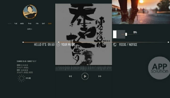 中心屏幕顶端是作者头像,外面环绕一个圆形进度条,下方是周内日期的动态显示,看似简单,实际上包含了 KLWP 设置组件的重要技巧:重叠组的应用。