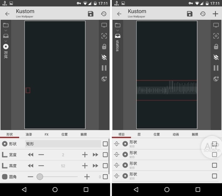 壁纸 Flash 中出现了很多KLWP 系统中并没有提供的图像元素,但我们拆开壁纸包后,发现其实奇怪的图案并没有脱离基本图形的范畴:比如贯穿屏幕的射线,就是一个很小的圆形加上一个很扁的矩形,在 fx 中选择水平渐变特效,一条射线就这样诞生了。是不是很简单?