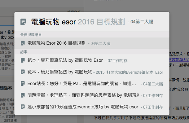 他的限制其实是他的优点,因为这个快捷搜索列的目的,其实是让我们「快速切换」笔记,当我们在某一则笔记中编辑到一半,需要跳到另外一则笔记查看资料或是复制贴上,这时候启动搜索框,输入笔记标题关键字,就能快速开启笔记。