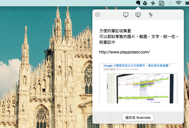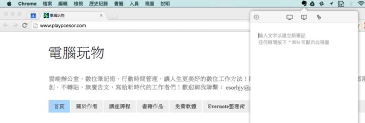 这个功能就是点击 Mac 上方功能列的 Evernote 按钮,会弹出一个快捷笔记面板,或是用「Ctrl + Command + N」快捷键,可以呼叫出这个快捷面板。