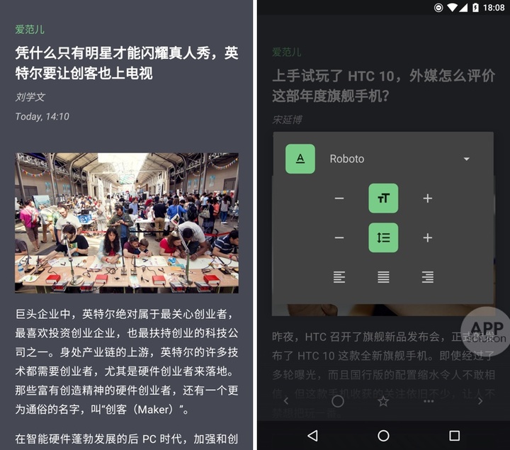 进入阅读后,Quote 继续保持了深灰绿的底色加上白色的字体,大概是考虑到这种配色无论在何时进行阅读都能有较为舒适的体验。在向下滑动的过程中,设置按钮和系统 UI 都会被隐藏,真正做到沉浸在文章中。在字体设置中,可以用户可以设置字体大小、行距、对齐格式等等,自由度非常高。