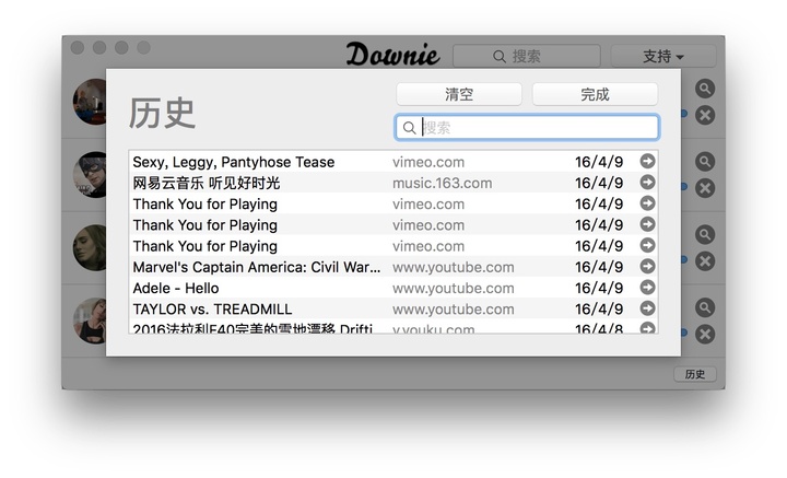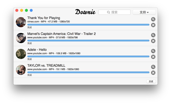 历史列表方便用户对已下载的视频进行查找。