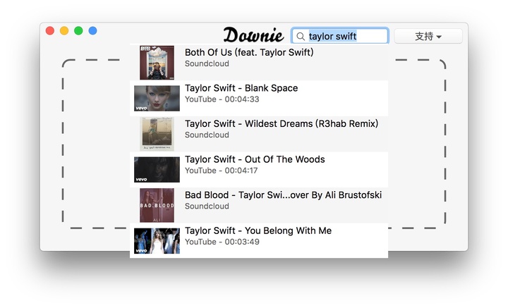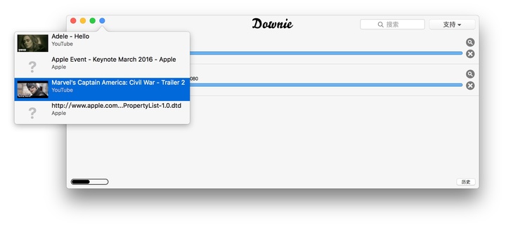 如果你想下载的视频不在 Downie 的网站列表支持范围内,可点击右上角的「支持」给开发者提 Request。视频下载的操作极为方便,只需将 URL 从浏览器拖入 Downie 主窗口即可开始下载视频,另外还有另外三种方法也可下载视频: