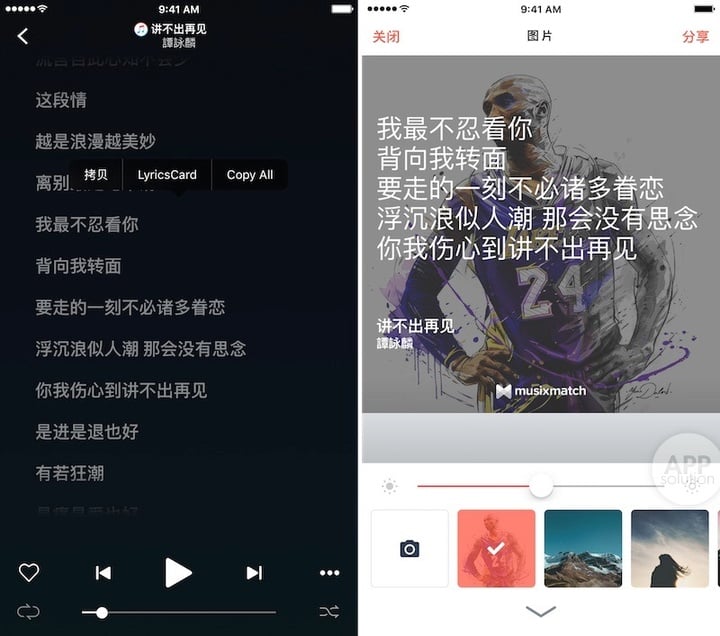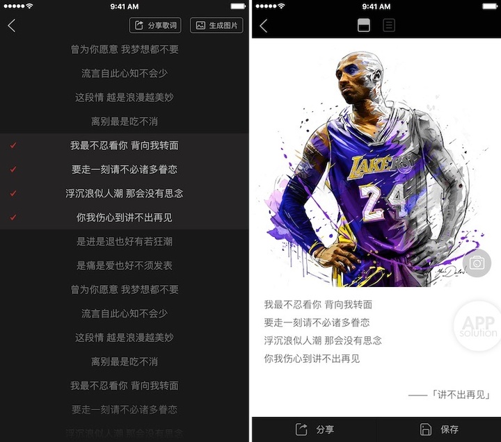 而网易云音乐也有非常好用的歌词分享功能,长按选择你喜欢的歌词,选择「生成图片」,再选择一张你之前搜集的科比图片将专辑封面替换掉,一张可以发朋友圈的歌词海报就完成了。