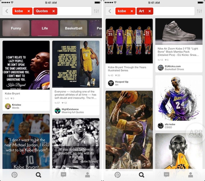 下载 Pinterest,登录后直奔搜索框输入「Kobe」,看到搜索结果之后你会回来点赞的。