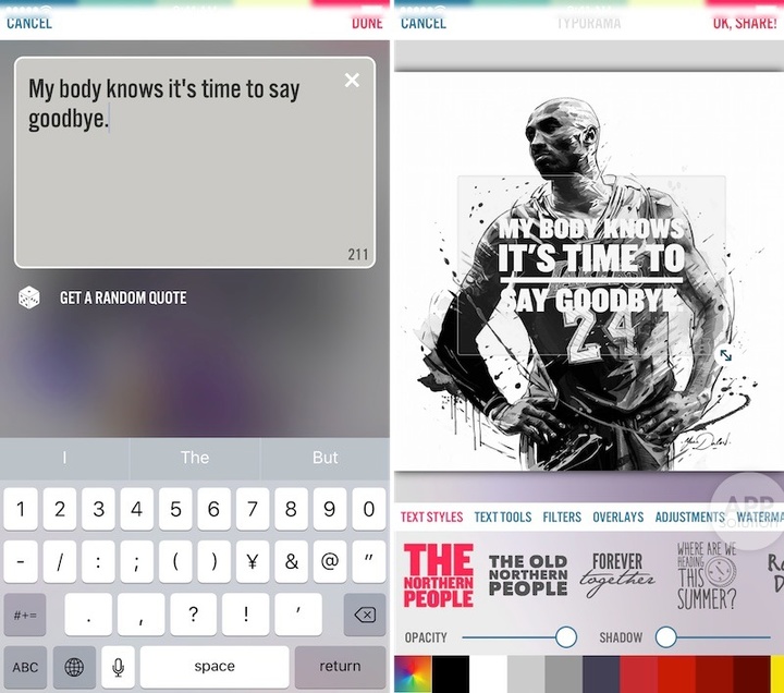 这张图花了 A 君 30 秒,怎么能花 30 秒这么长时间呢!此外,Typorama 还提供了丰富的文字自定义选项以及基本的修图功能。