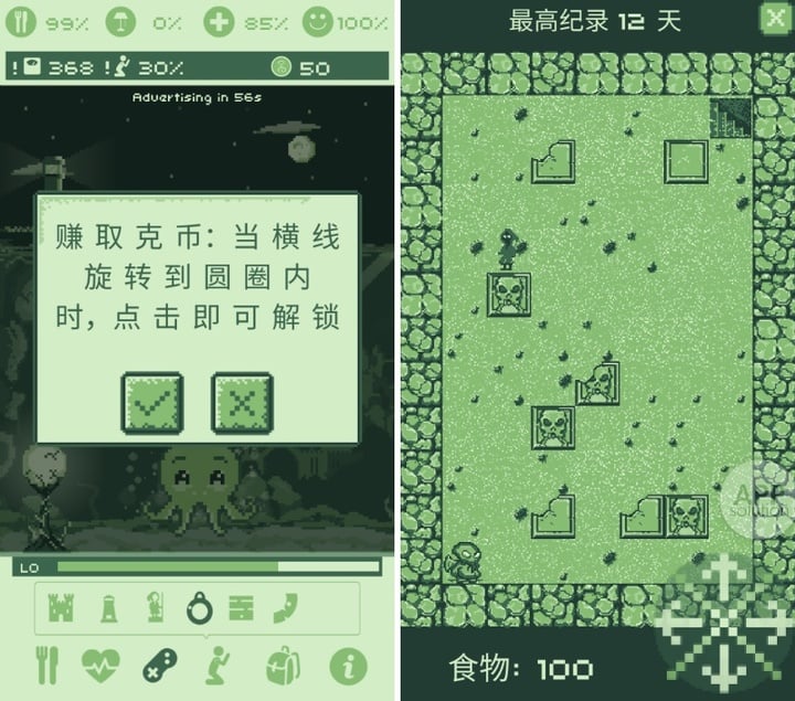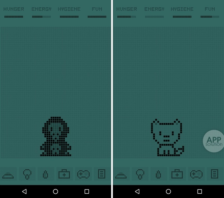 Wildagotchi 是一款最经典也最本质的电子宠物游戏。把当年的电子宠物移植到今天功能强大的手机上之后,Wildagotchi 并没有借助手机强大的性能过多美化游戏效果。8 bit 画风,缺少动画特效,没错,这才是我们记忆里的电子宠物。