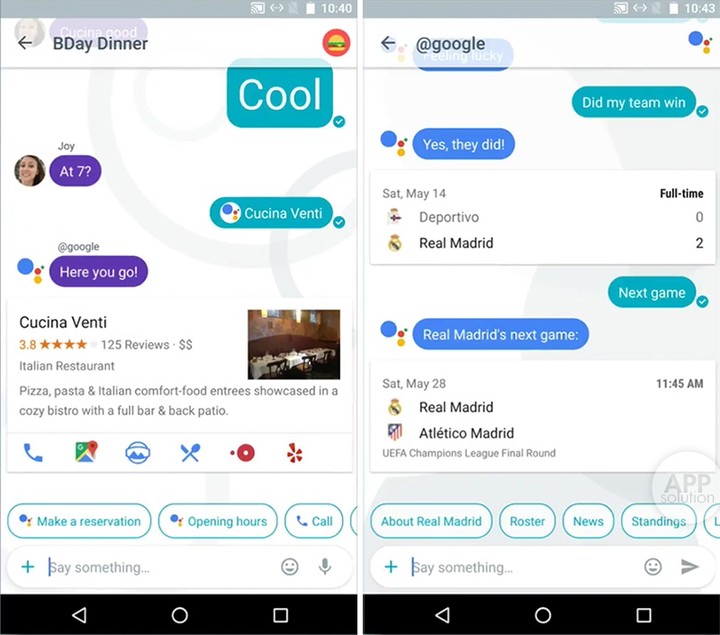 类似于之前 AppSo(微信号 appsolution)曾推荐过的 Flow,Allo 在聊天中直接植入了 Google 助手。