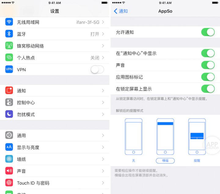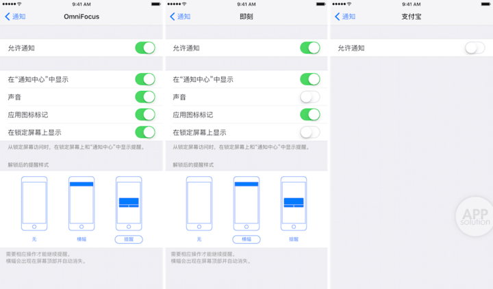 上面最后 2 种是锁屏时的通知,另外在解锁时你也有 3 种通知方式选择:无、横幅和提醒。