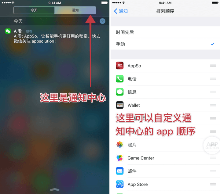 ②通知中心:通知中心指从屏幕顶端下拉后左扫出现的黑色视图。它不会打扰你,而是排好队,静静地蹲在通知抽屉里等待你的翻阅。顺序默认按照时间先后排列,但你也可以在「通知」-「排列顺序」-「手动」中自定义它们的顺序。