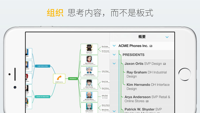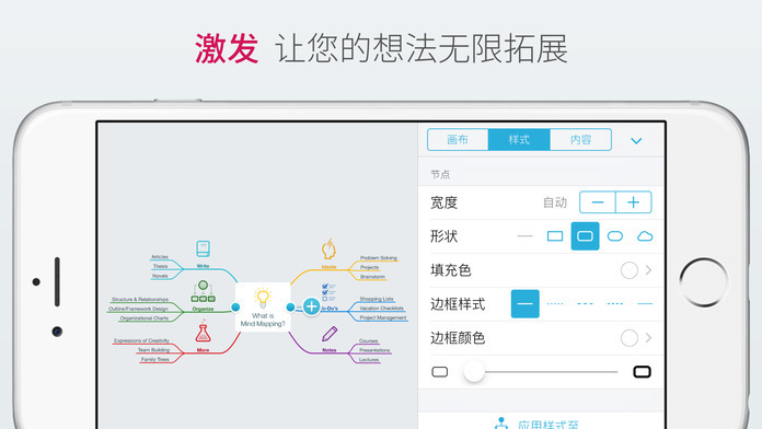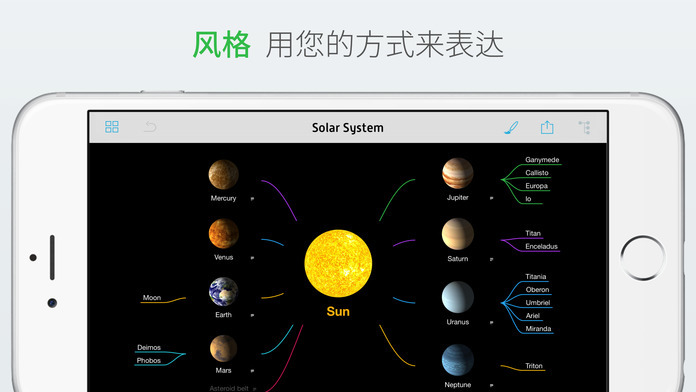 以下为 MindNode 的 iOS 版本官方配图,可以看出它相比其他脑图的一大优点,就是好看……当然,其他功能也很丰富,我对它非常满意。它同时支持 iPhone 和 iPad,思维导图还能通过 iCloud 同步。