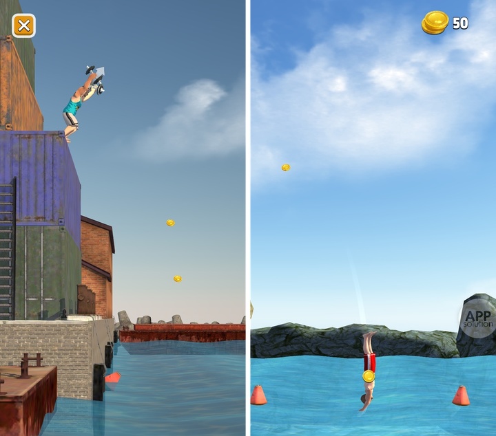Flip Diving 适用于 iOS 8.0+ 的 iPhone 和 iPad 及 Android 2.3+ 的设备,iOS 版 133 MB,Android 版 77 MB,免费有内购。