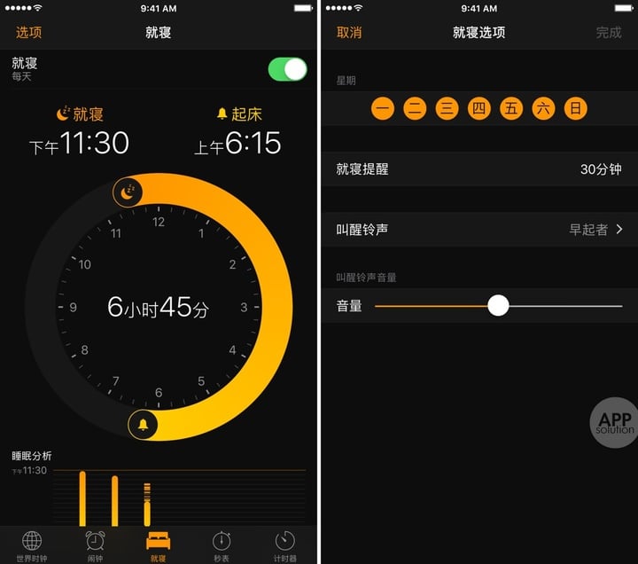 你可以设置自己想要的睡觉和起床时间,时钟 app 会在你指定的时间提醒你睡觉(当然,你不睡它也没法拿你怎样……),再在你指定的时间叫你起床。