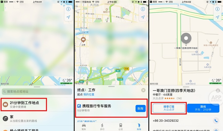 另外,有了第三方服务和数据的加持,苹果地图更加强大。举个例子:在你找到目的地后,你可以直接在地图里选择「叫车」,再调用第三方打车 app 来提供服务;找到一家餐厅后,可以直接通过大众点评来订座位等等。