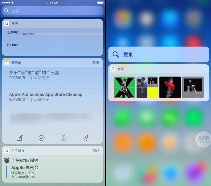 还有两个地方可以看出苹果对插件的重视。一是苹果给不少原生应用加上了 Widget 支持,比如音乐、备忘录、日历(左下图);二是现在 iPhone 6s 以上机型可以通过 3D Touch 主屏幕图标来唤出 app 插件(右下图)。