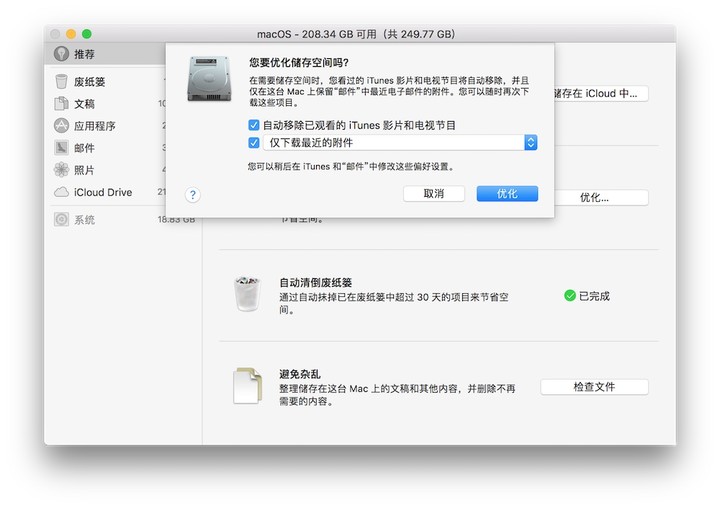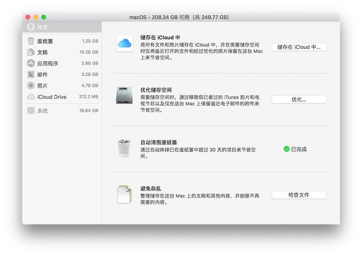 另外,macOS Sierra 中提供了多种途径让我们对存储空间做出优化。我们可以在「关于本机」-「存储空间」中看到四个推荐选项(需要手动开启),我们一一来说。