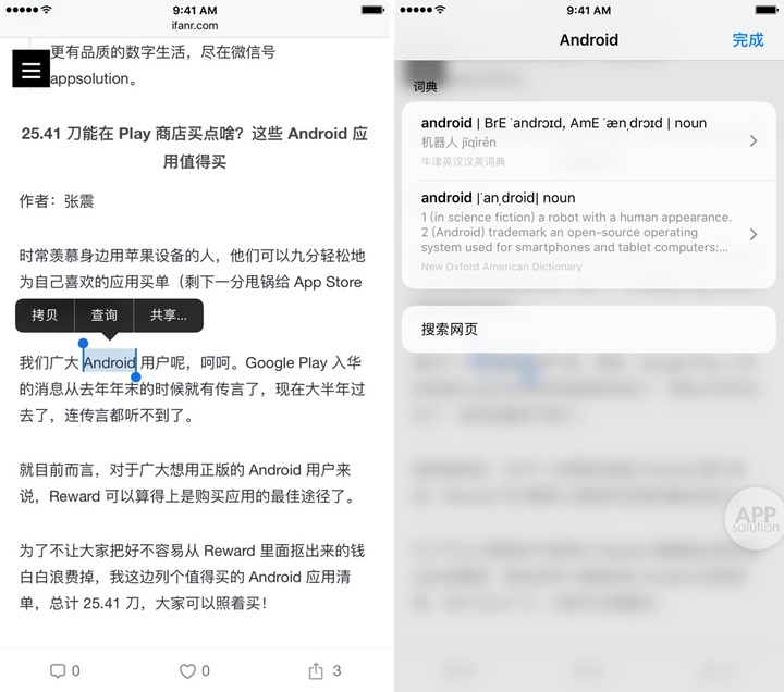 除了系统自带,也有一些第三方 app 可以实现类似的功能。你可以在微信号 appsolution 后台回复「翻译」获取 3 款 Android 应用推荐。