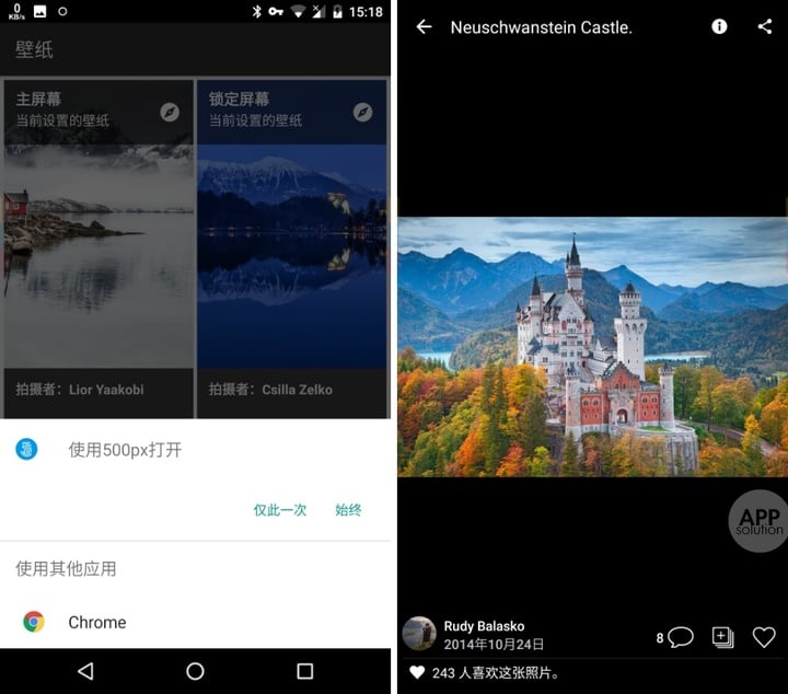 比如我在用的壁纸,就是 500px 用户拍摄的作品。