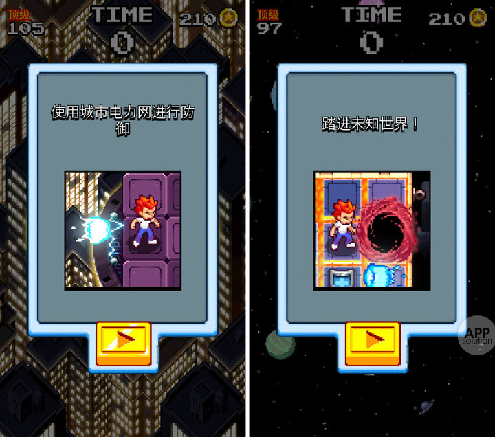 每个地图不仅有着风格迥异的画面,也有着自己的特色玩法。比如在高科技城市的地图内,每当将人物移动到边缘,便会在特定方向形成一个能够抵挡冲击波的电磁网。