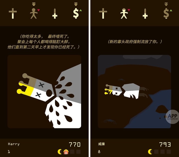 让 AppSo(微信号 appsolution)赞叹的是,国家治理是庞大的工程,而 Reigns 巧妙地采用卡片式的事件决策,既简化了过程,又保留玩家对国境内事无巨细的掌控。