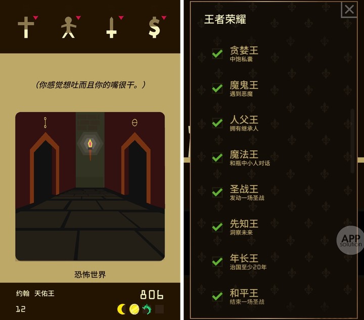 Reigns 有各种有趣的国王谥号和成就可以解锁,也有任务系统暗示剧情发展——地牢里究竟藏着什么秘密?魔鬼的目的又何在?