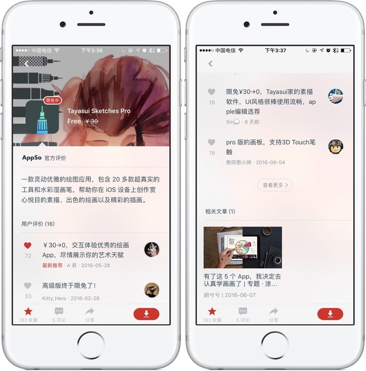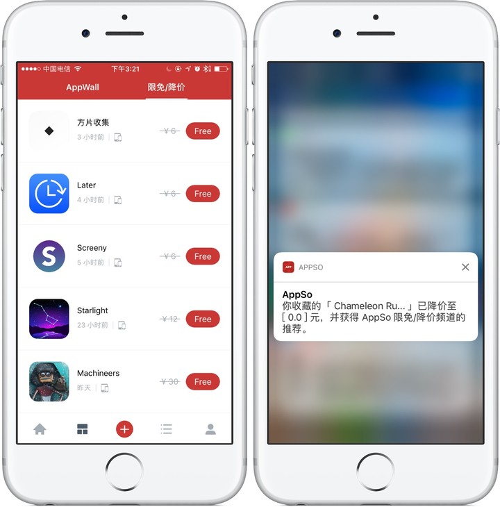 如今,你不仅可以非常方便地在 iOS 客户端中看到这部分内容,还能享受 AppSo 为客户端用户准备的专享功能 —— 限免 / 降价消息订阅。
