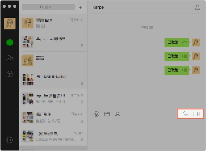 更新 Mac 版微信后,在个人聊天窗口会发现两个新的按钮,分别对应语音通话和视频通话。