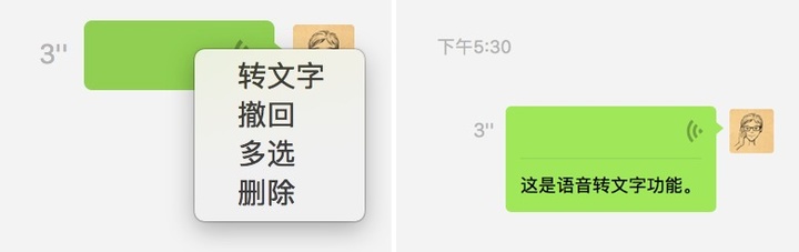 在 2.1 版的 Mac 微信上,在语音消息上点击右键,会看到「转文字」选项,让你不播放语音也能了解语音里说的内容。