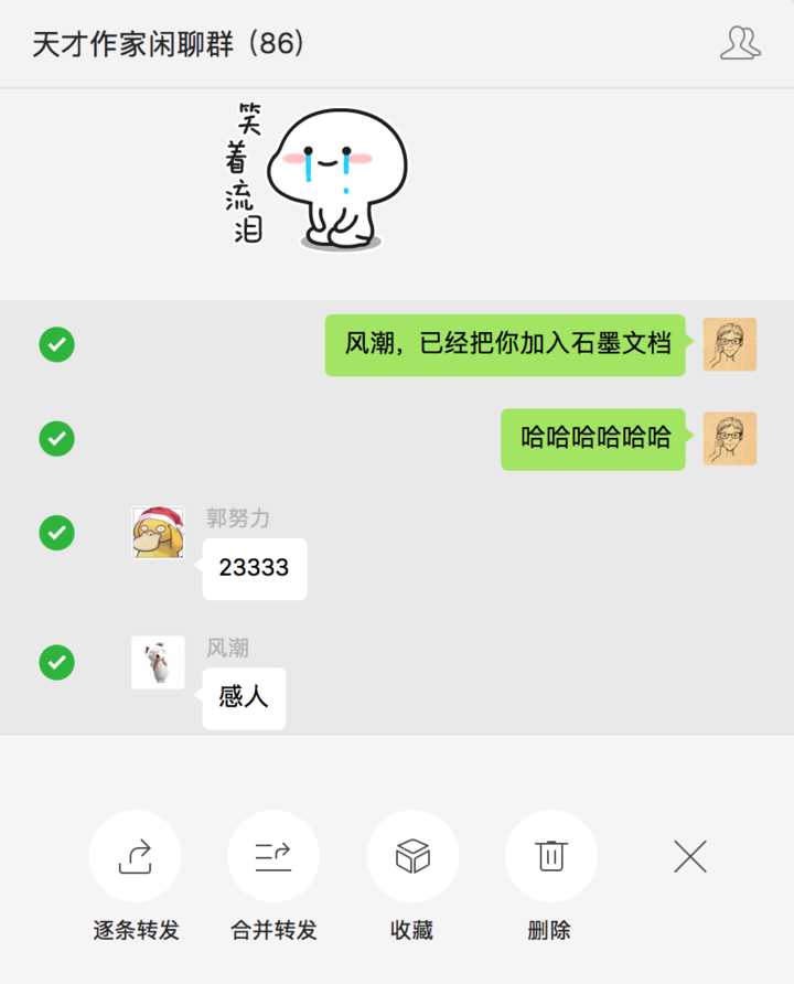 在聊天消息上点击右键,选择「多选」即可进入多选模式,你会看到原先的输入框位置被「逐条转发」「合并转发」「收藏」和「删除」替代。