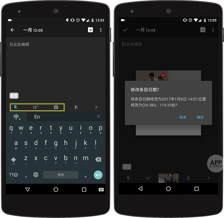 另外,当插入照片时,Journey 还会自动检测照片的拍摄地点和拍摄时间,并弹出提示,询问「是否要把该日记的地点和时间替换成插入照片的地点和时间」。