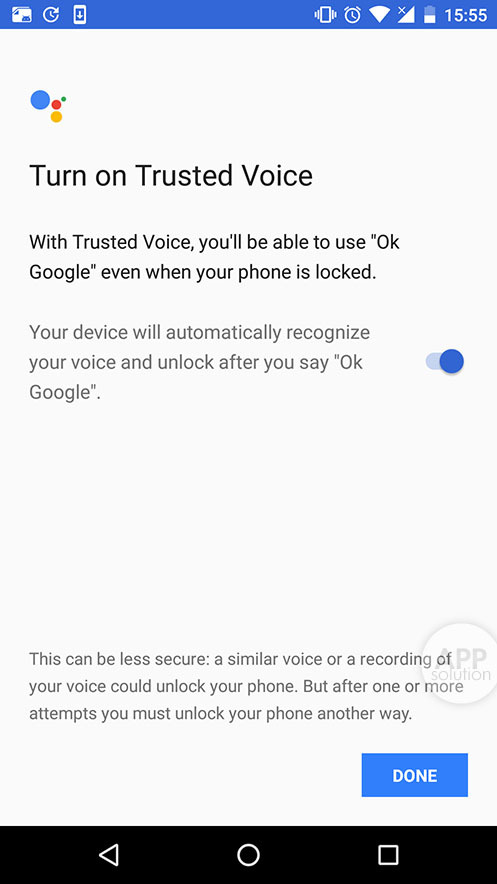 但是,设置 OK Google 来解锁设备后,如果有「不法分子」偷偷录了我的声音,那么他也可以拿着「OK Google」的录音来解锁我的手机,貌似 Google 现在也无法判断哪些是录音,哪些是人声。