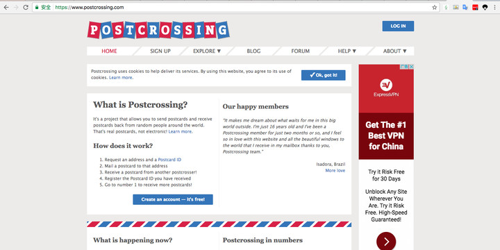 一个可以收到国外明信片的地方。你随机拿到国外地址,寄出一次,也会有人在国外随机拿到你的地址寄给你。然后足不出户就有世界各地的明信片啦!via WY_
