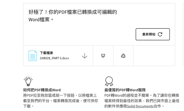 因为 Smallpdf 是和专业的 PDF转换软件厂商 Solid Converter 合作,所以转换效果才会如此优异,不输我之前推荐过的「PDF 转 Word 线上 Cometdocs 完美的中文版面转换」。