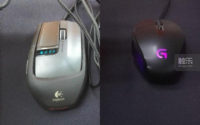 他的鼠标,从 A9500 芯片的 G9x(左),换成了 Pmw3366 芯片的 G303(右)——Pmw3366 是普通光电鼠标中,性能最强的主控芯片。