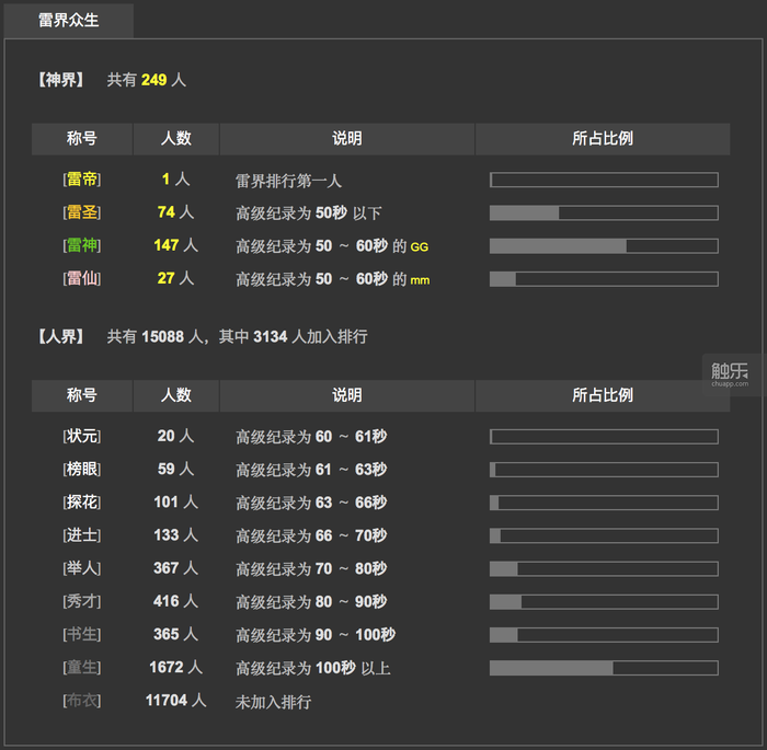 这里有着看似森严的等级制度,以扫雷高级记录 60 秒为分界,超过 60 秒的玩家属于「人界」,60 秒以内的玩家属于「神界」。高级局完成时间进入 50 秒以内将升格为「雷圣」。