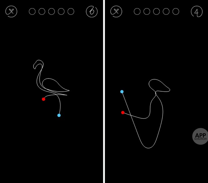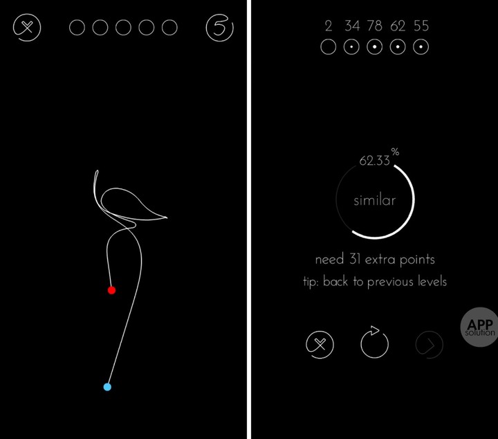 通过点击屏幕指引彩色球的方向,并使特定的球切开「一笔画」的图案。然后游戏会根据你切割的线条长度对比,给出一个评分。收集这个评价积分可以开启新的关卡。