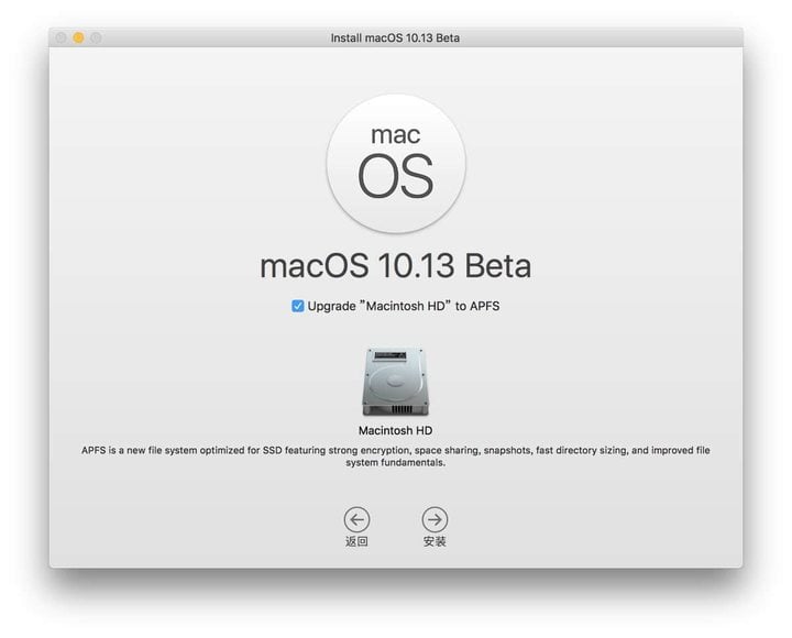 在安装 macOS High Sierra 之前,你会看到一个是否升级 APFS 的勾选框。