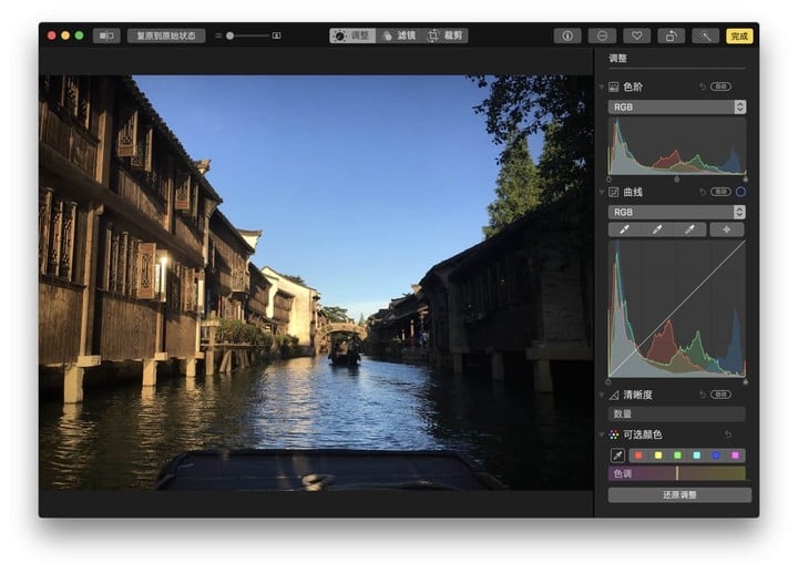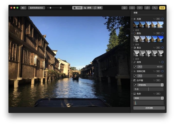像「白平衡」、「消除红眼」、「色阶」、「降噪」、「曲线」、「锐化」等传统功能,在照片应用内都可以直接搞定了。