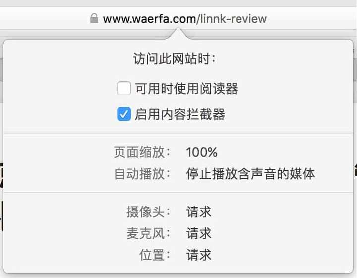 比如是否可以用阅读器,是否启用内容拦截器,调整页面缩放比例,自动播放的设置,以及对摄像头、麦克风、位置信息的权限控制。