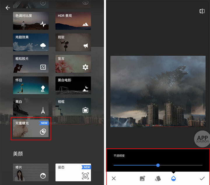 Snapseed 中的「双重曝光」功能,能让我们把两张图片重叠在一个区域中。