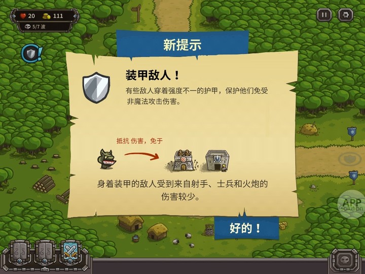 当然,Kingdom Rush 并不希望玩家暂停下来研究,毕竟暂停后的弹出窗口挡住了大部分游戏画面。