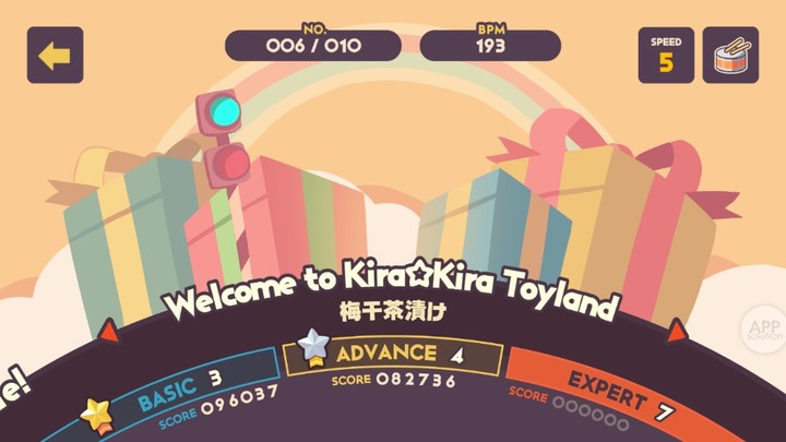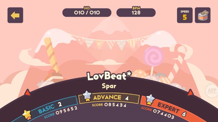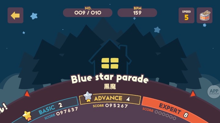 乐曲的难度分为三级:Basic、Advanced 和 Expert,配合曲速和等级的提示,玩家可以比较准确地了解乐曲的难度。说实话,有些 Expert 难度真的特别夸张……