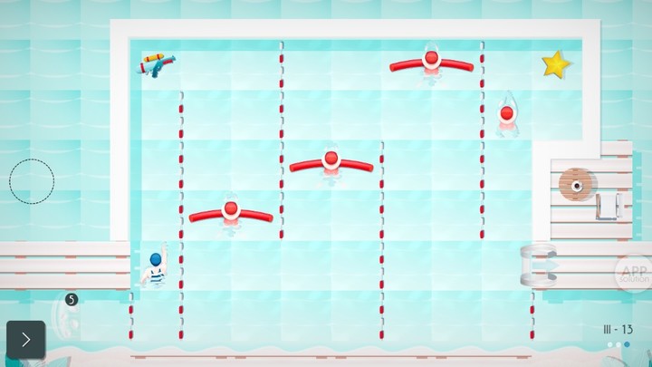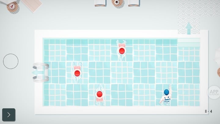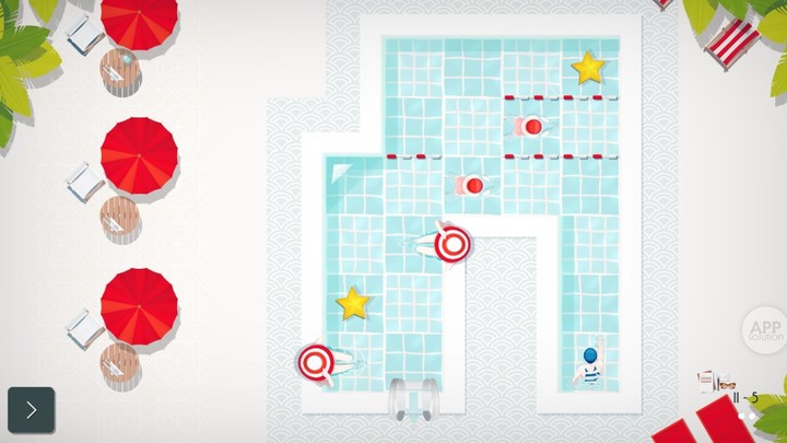 游戏以「走格子」的形式进行,玩家走一步,「泳池杀手」们也会走一步。光是通过还不够,玩家还要使用最少的步数完美通关,才能获得最高评价。
