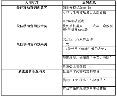 自启动移动营销大奖案例征集之日起,在短短一个多月的时间里,移动营销大奖项目迅速吸引了营销界的广泛关注,截至线上评审之前,移动营销四大奖项征集到了来自30余家公司的80余项参选申请。同时,移动营销峰会组委会组建了堪称业内最强阵容评审团,对参选案例进行打分、评选,评审全程公平、公正、严谨,最终选出12强入围!他们分别是: 谁是赢家?敬请期待5月6日GMIC 2014 移动营销峰会现场揭晓!