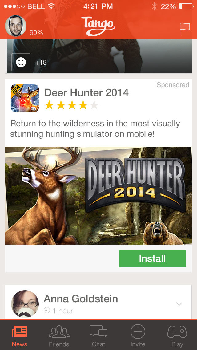 比如在阿里巴巴投资的通讯社交软件 Tango 中,就有 InMobi 提供的原生广告。开发者通过植入 InMobi 的 SDK 即可实现,InMobi 号称植入成本十分低,只需要一天时间加入数行代码即可。